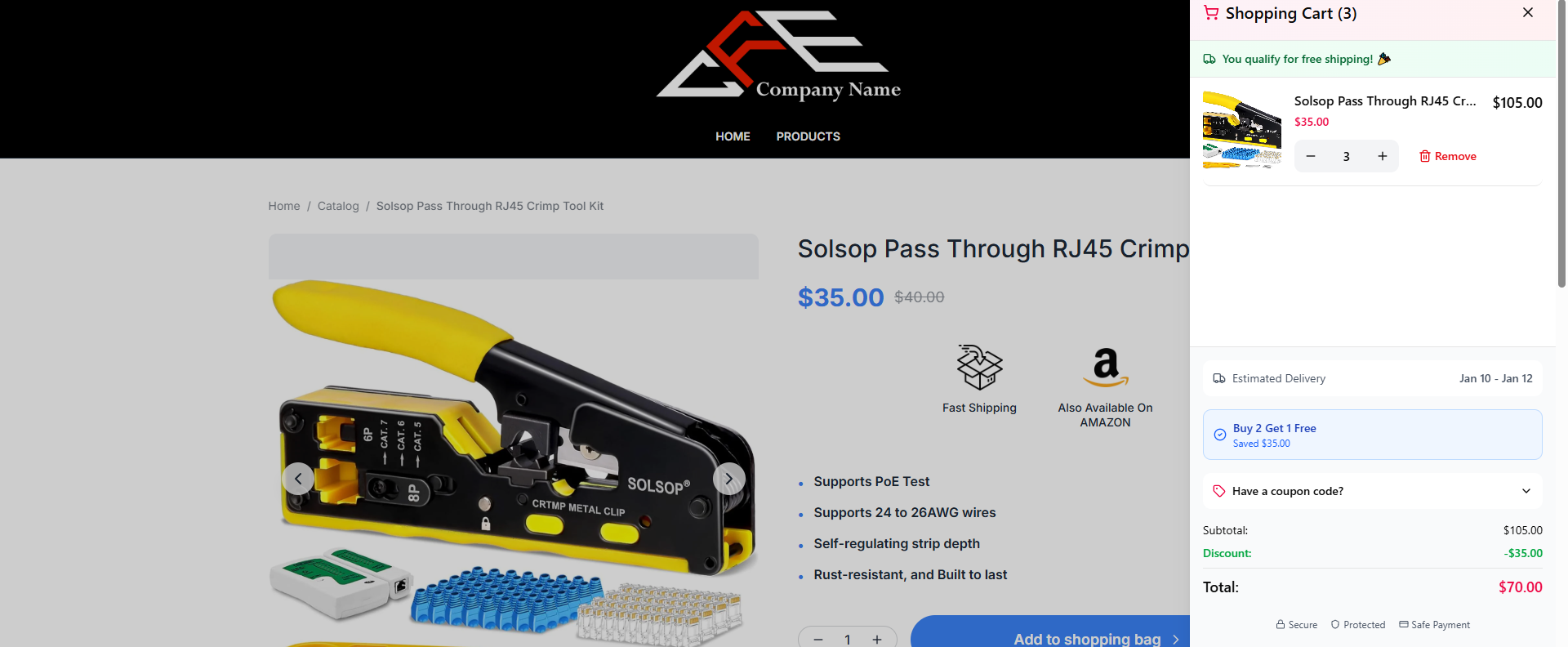 Visual Indicators: "You qualify for free shipping! 🎉" message in cart